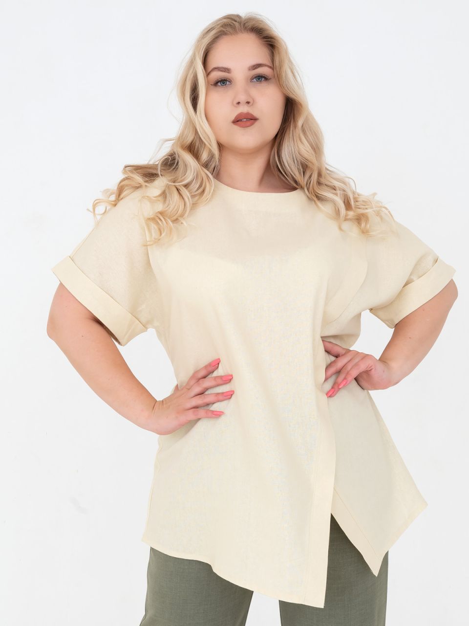 Лаконичная блуза из льняной ткани свободного силуэта. Модель имеет круглый вырез и необычный ассиметричный крой по переду, который приковывает взгляды и визуально добавляет динамичности изделию. Застежка-капелька по спинке элегантно сочетается с кроем изделия.