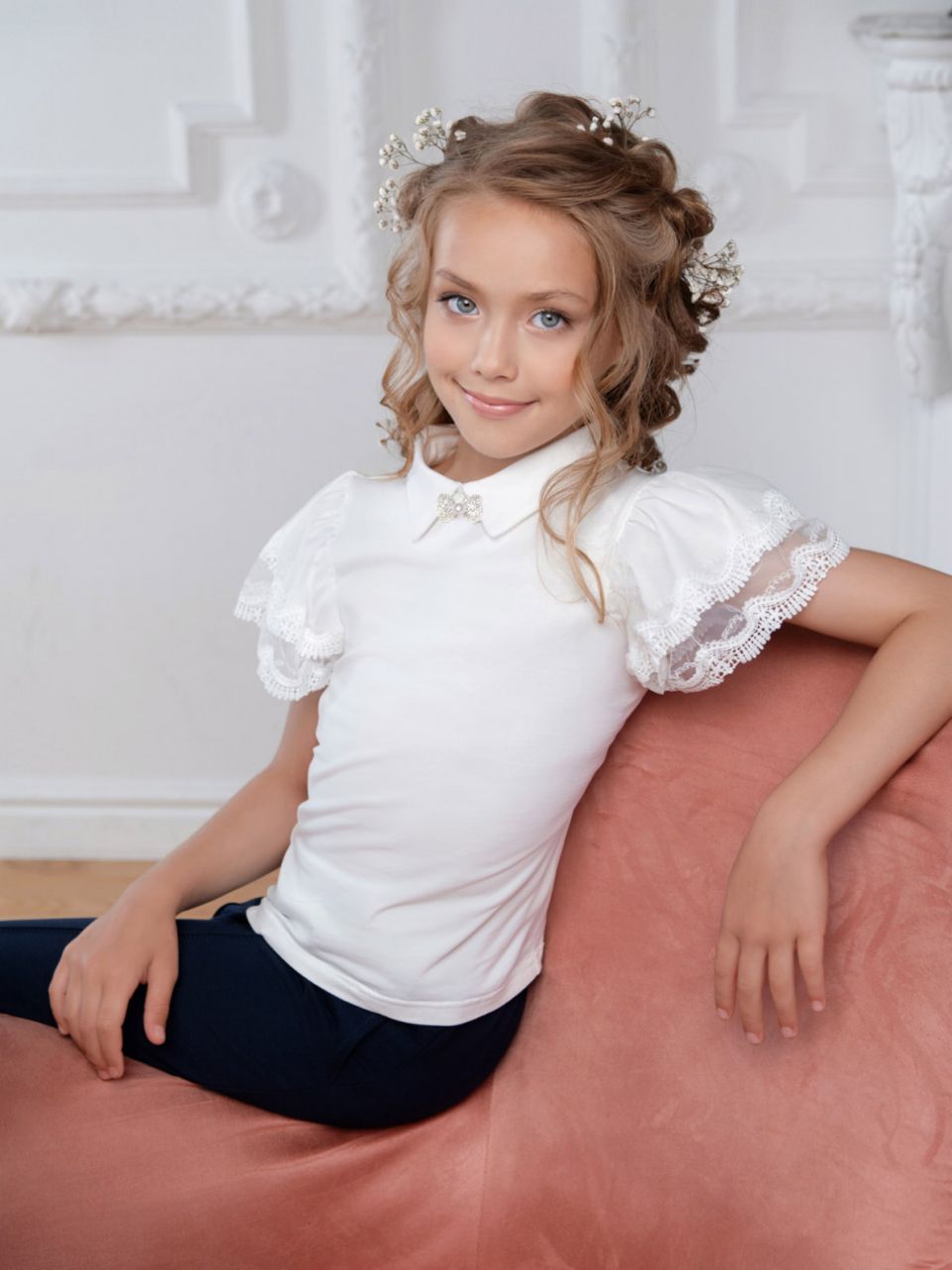 Блузка Анфиса — элегантная модель для школы и праздничных мероприятий. Выполнена из мягкого трикотажа с кружевными рукавами и аккуратным воротником. Декорирована съёмной брошью в виде банта. Сочетает нежность и строгий стиль.