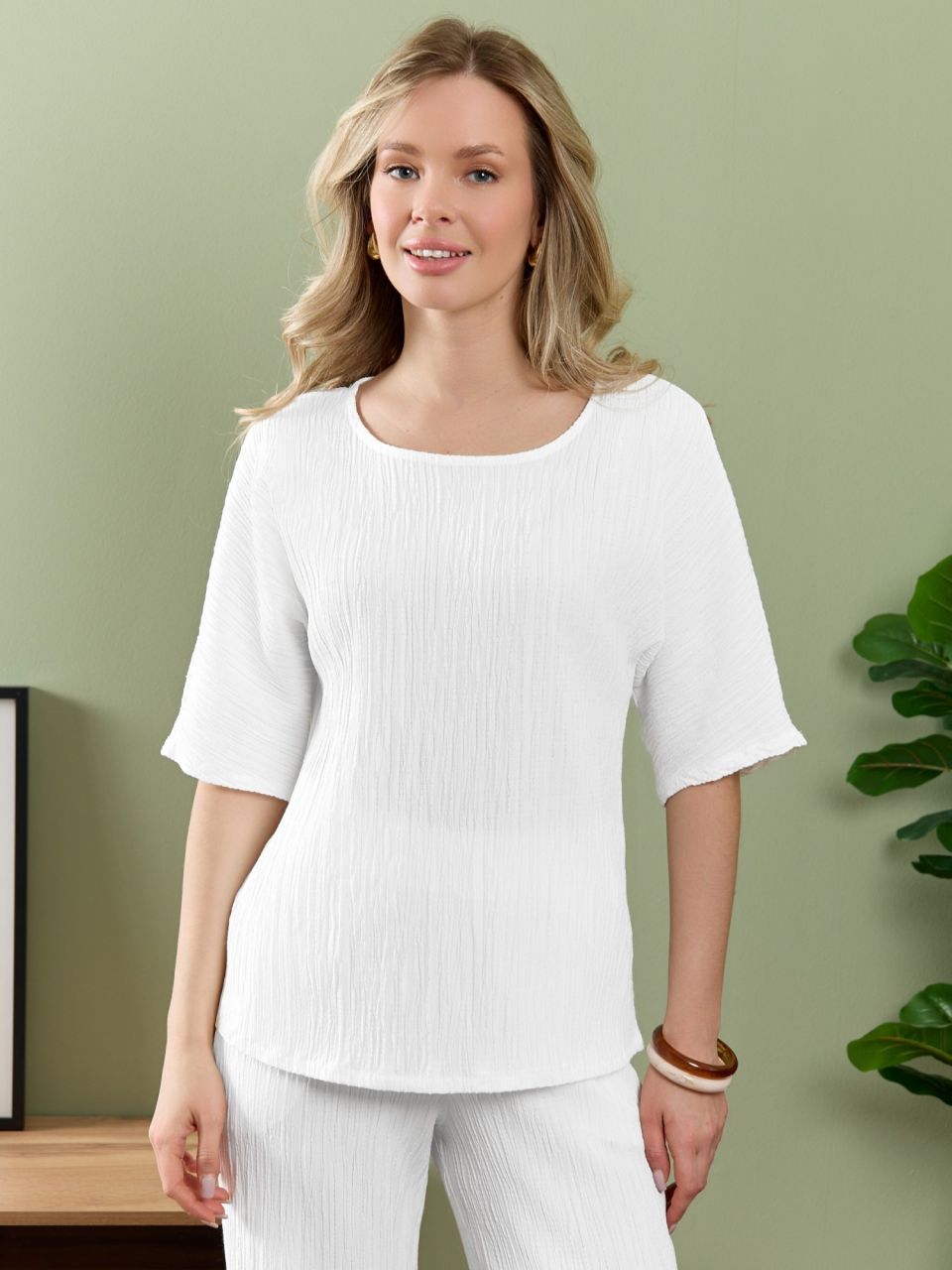 Блуза женская из гладкокрашеного тканого полотна, прямого силуэта, с горловиной овальной формы и цельнокроеными рукавами длиной до локтя. Горловина окантована основным материалом.При выборе изделия в белом цвете идеальным решением будет выбор белья нейтральных