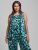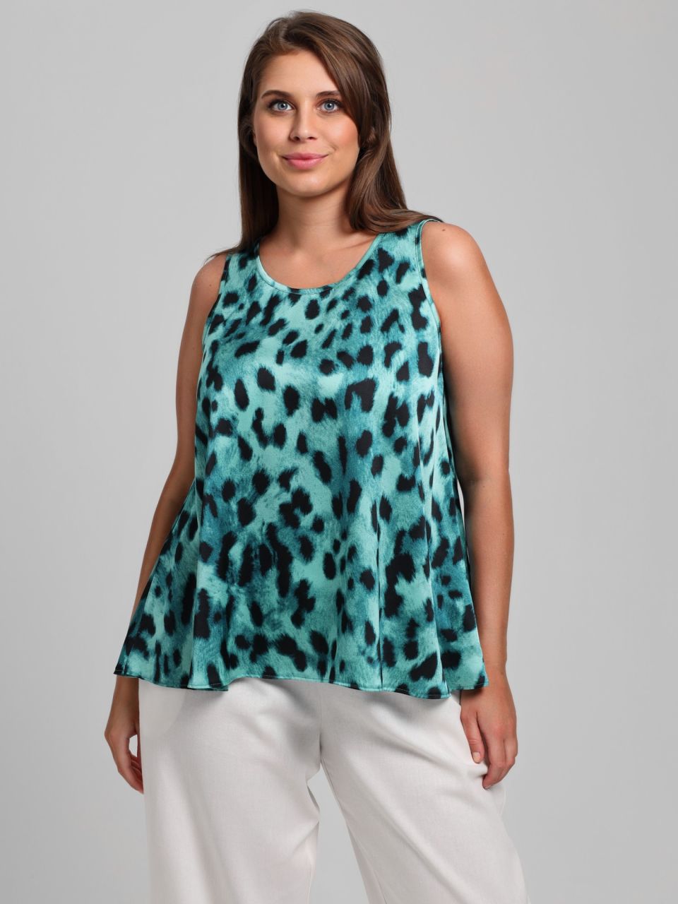 Блузка женская из тканого полотна «искусственный шёлк полиэстер» с набивным рисунком, расклешенного силуэта, без рукавов, с овальным вырезом горловины, окантованным основным материалом.