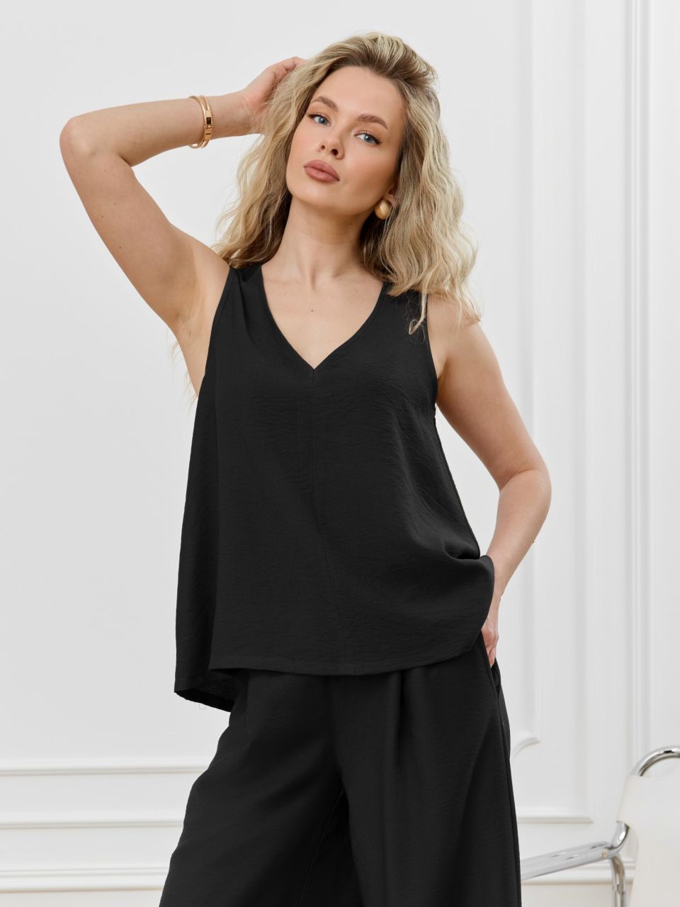 Блуза -топ из гладкокрашеного фактурного полотна средней длины, расширенный книзу, с горловиной v-образной формы. Полочка и спинка - со средними швами. Горловина и проймы окантованы основным материалом, низ изделия обработан подгибкой.