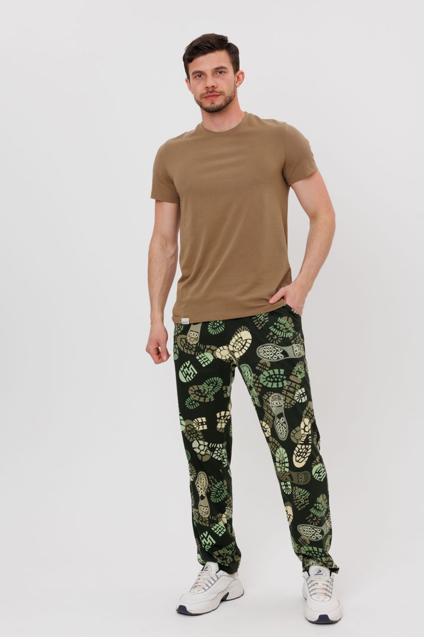 Мужские брюки свободного кроя с карманами в боковых швах. Пояс выполнен из ткацкой резинки с принтом.