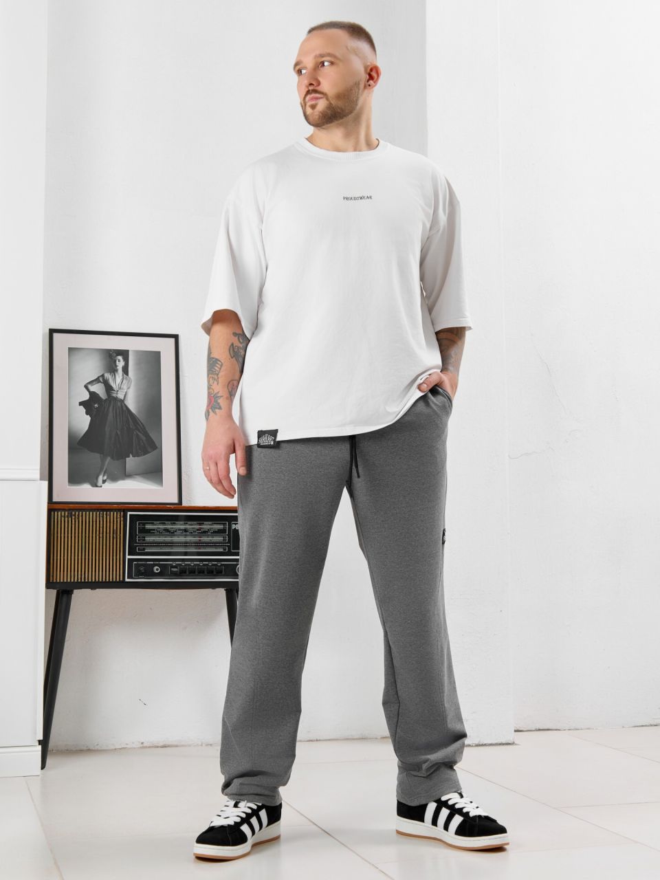 Брюки мужские прямого силуэта, из трикотажного полотна «футер двунитка с лайкрой». Модель с рельефными швами по передним деталям, декоративной «нашивкой», с карманами в боковых швах, на притачном поясе с отстроченной эластичной тесьмой и шнуром для регулирования степени прилегания изделия по линии талии, продетым через две обметанные петли в центре пояса.