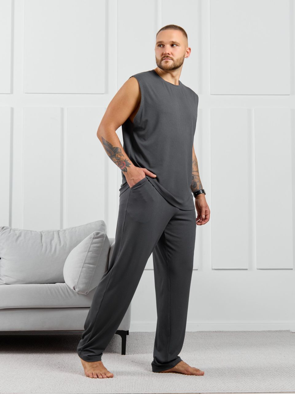 Брюки мужские из пластичного однотонного трикотажного полотна в рубчик, приятного к телу. Модель свободная, прямого силуэта, с боковыми карманами с обтачными входами, на притачном поясе с отстроченной эластичной тесьмой.