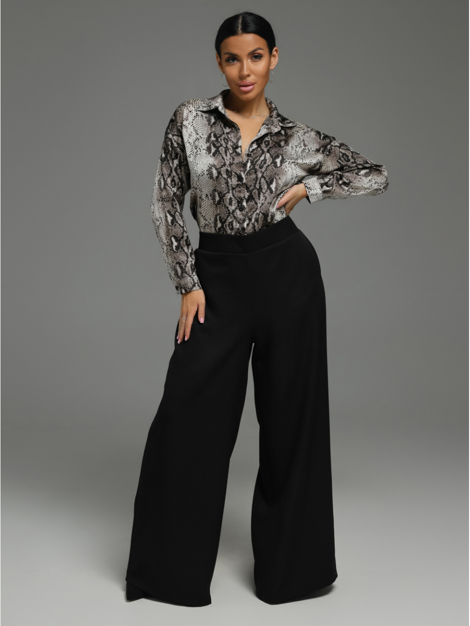 Брюки женские широкие с притачным поясом. Передние половинки с карманами с отрезным бочком с наклонным входом.