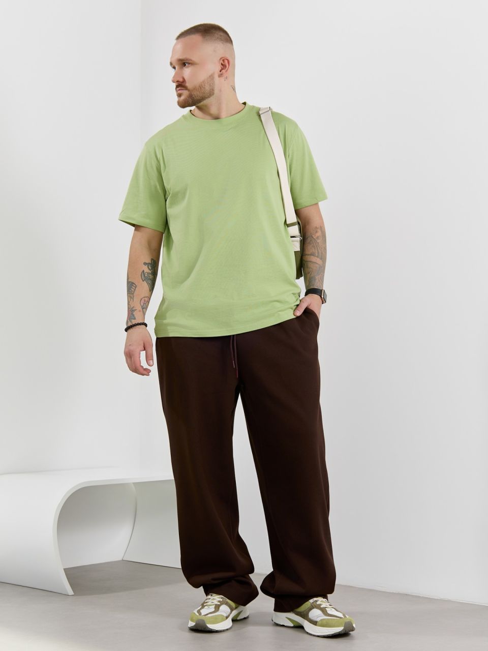 Брюки мужские из трикотажного полотна "интерлок-пике", на притачном поясе с эластичной тесьмой внутри, с карманами в боковых швах. Низ брюк прямой с подгибкой. Для регулирования степени прилегания изделия по линии талии предусмотрен декоративный шнурок, вставленный в пояс и продетый через две обметанные петли в центре.