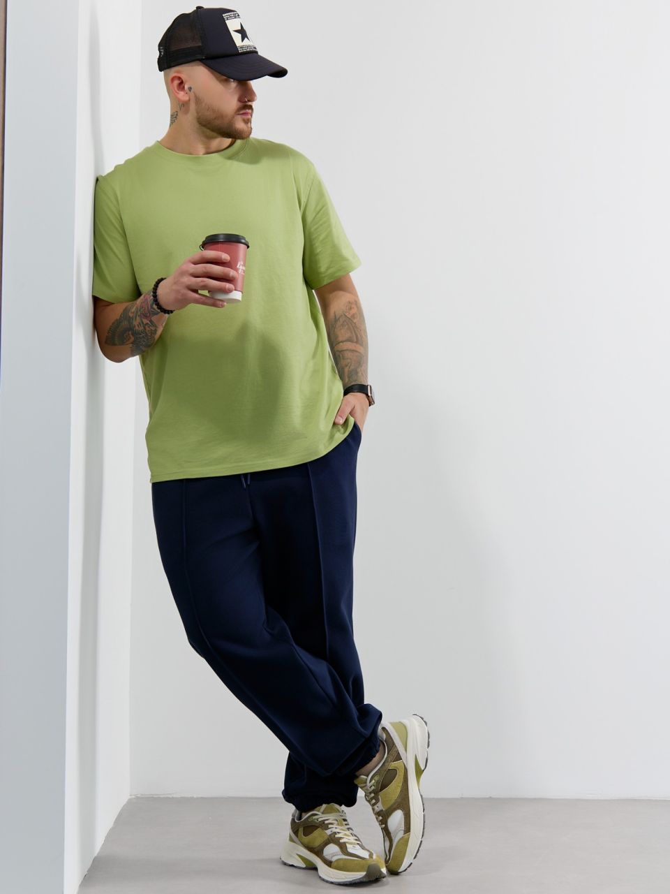Брюки мужские из трикотажного полотна "интерлок-пике", на притачном поясе с эластичной тесьмой внутри, с карманами в боковых швах. По центру передних половинок расположены стрелки, закрепленные отделочной строчкой. Нижние срезы обработаны подгибкой с эластичной тесьмой. Для регулирования степени прилегания изделия по линии талии предусмотрен декоративный шнурок, вставленный в пояс и продетый через две обметанные петли в центре.