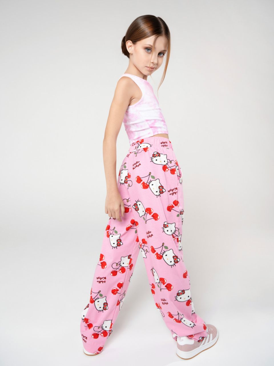 Яркие и удобные брюки для девочки с забавным принтом Hello Kitty и вишенками. Модель на мягкой резинке, не сковывает движения и отлично сидит. Идеальны для дома, отдыха и прогулок. Популярная расцветка и только положительные отзывы от мам и дочек.