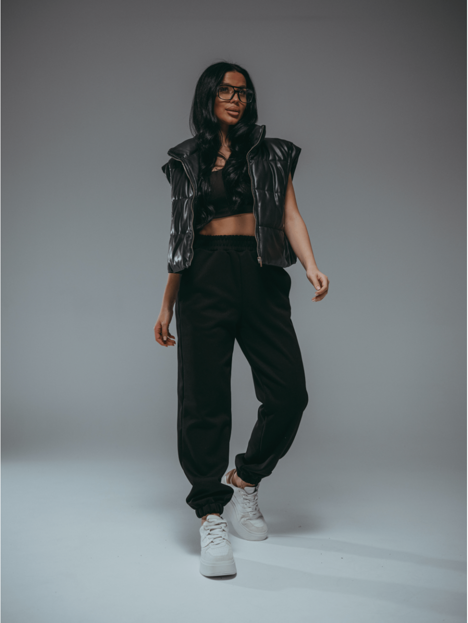 Брюки на резинке с отрезным поясом с карманами.