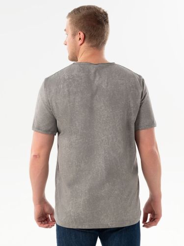 Классичесая футболка, с V-образным вырезом. Край горловины и рукавов срезан и края закручены.