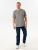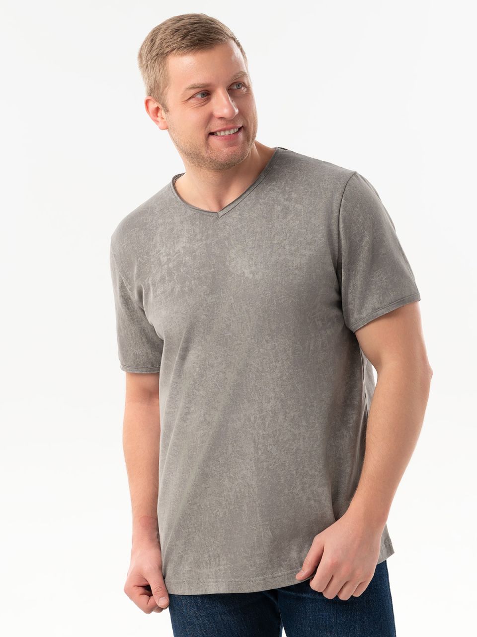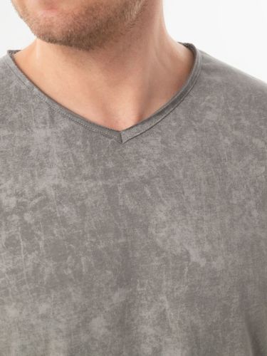 Классичесая футболка, с V-образным вырезом. Край горловины и рукавов срезан и края закручены.