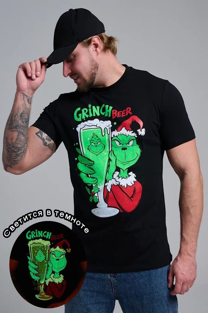 Чёрная хлопковая футболка с забавным принтом: Гринч в красной шапке держит большой бокал пива с пеной! Надпись "Grinch Beer" сверху, яркий зелёно-красный дизайн для новогоднего юмора.