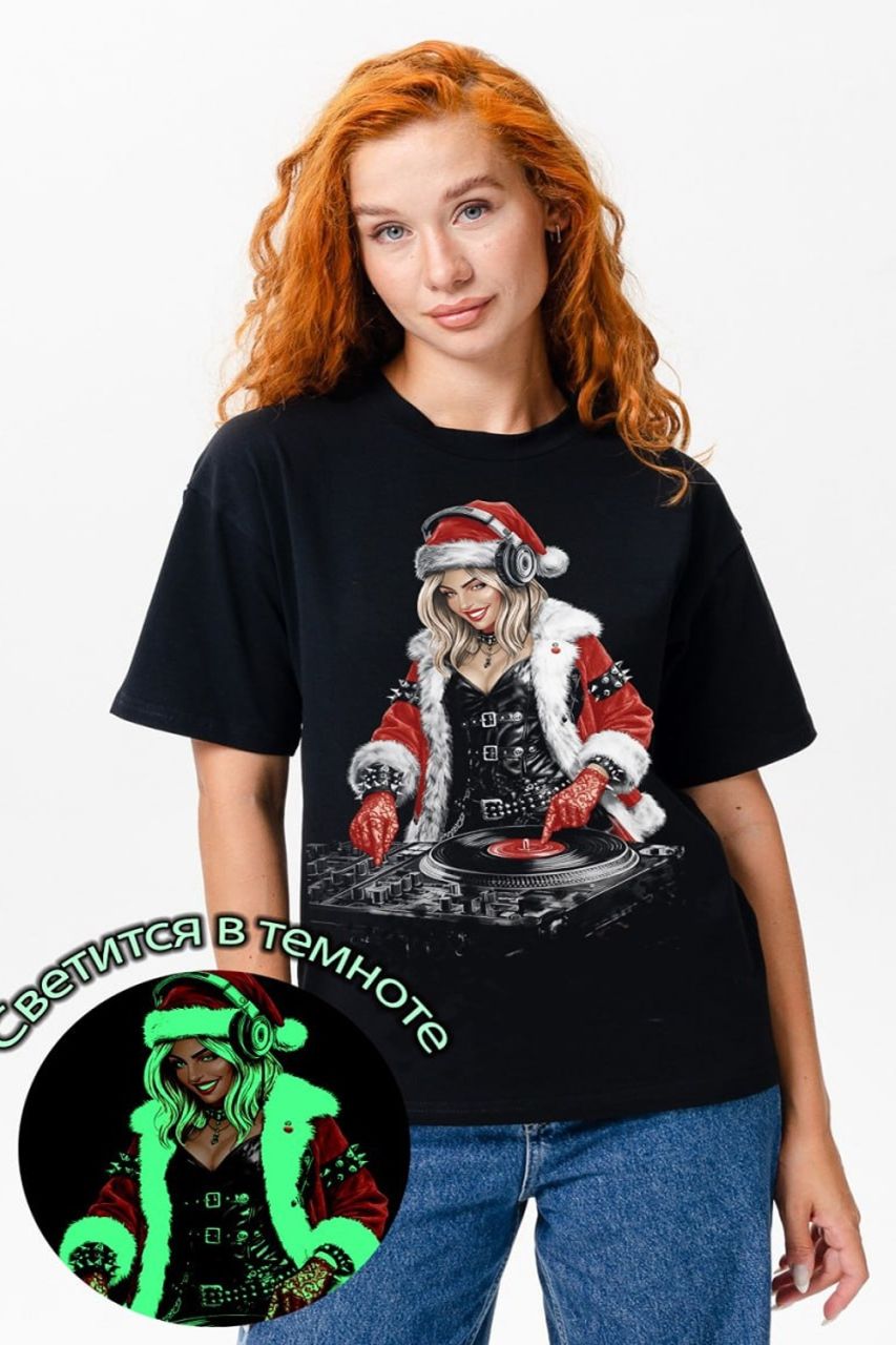 Черная футболка с ярким принтом DJ в стиле новогодней вечеринки — идеальный выбор для тех, кто любит быть в центре внимания! Необычный дизайн с изображением девушки-диджея в Санта-костюме дополнен эффектом светящегося рисунка в темноте, который создаёт вау-эффект на любой вечеринке или ночной прогулке. Удобный свободный крой и мягкий хлопковый материал обеспечивают комфорт в течение всего дня. Стильно, креативно, незабываемо!