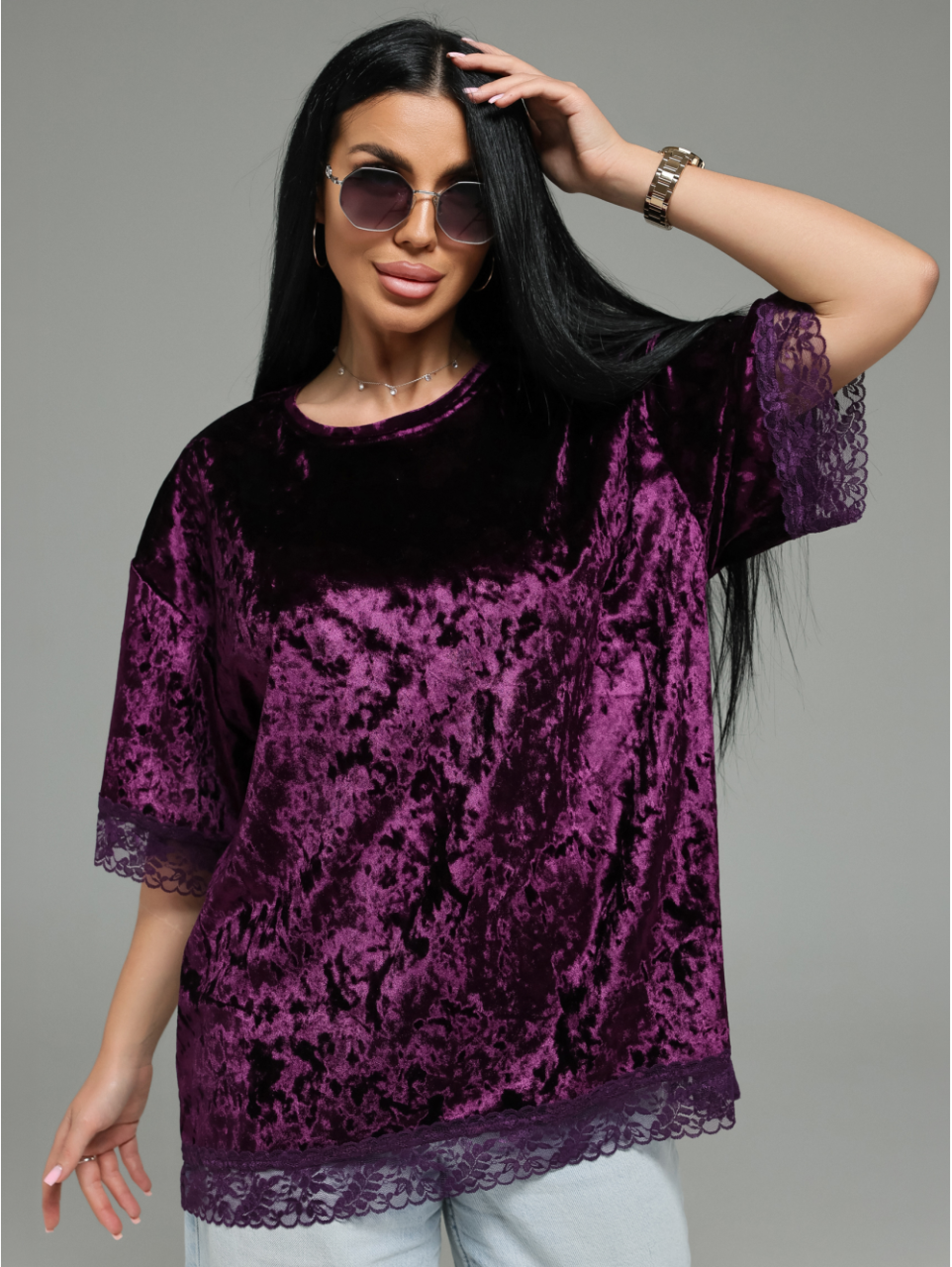 Сочетание роскошного бархата и нежного кружева — это смелый, но безупречно элегантный дуэт. Футболка подойдёт для создания как повседневных образов (с джинсами, брюками карго), так и для вечерних выходов (с юбкой, кожаными брюками). Оверсайз-крой дарит свободу, а кружево добавляет шарма.
