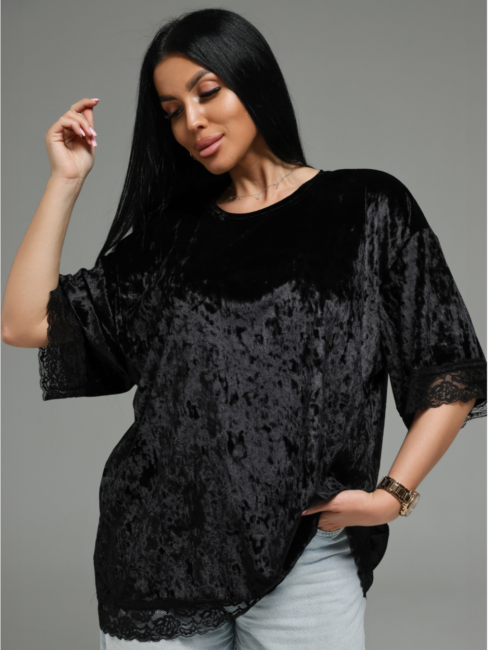 Сочетание роскошного бархата и нежного кружева — это смелый, но безупречно элегантный дуэт.Футболка подойдёт для создания как повседневных образов (с джинсами, брюками карго), так и для вечерних выходов (с юбкой, кожаными брюками).Оверсайз-крой дарит свободу, а кружево добавляет шарма.