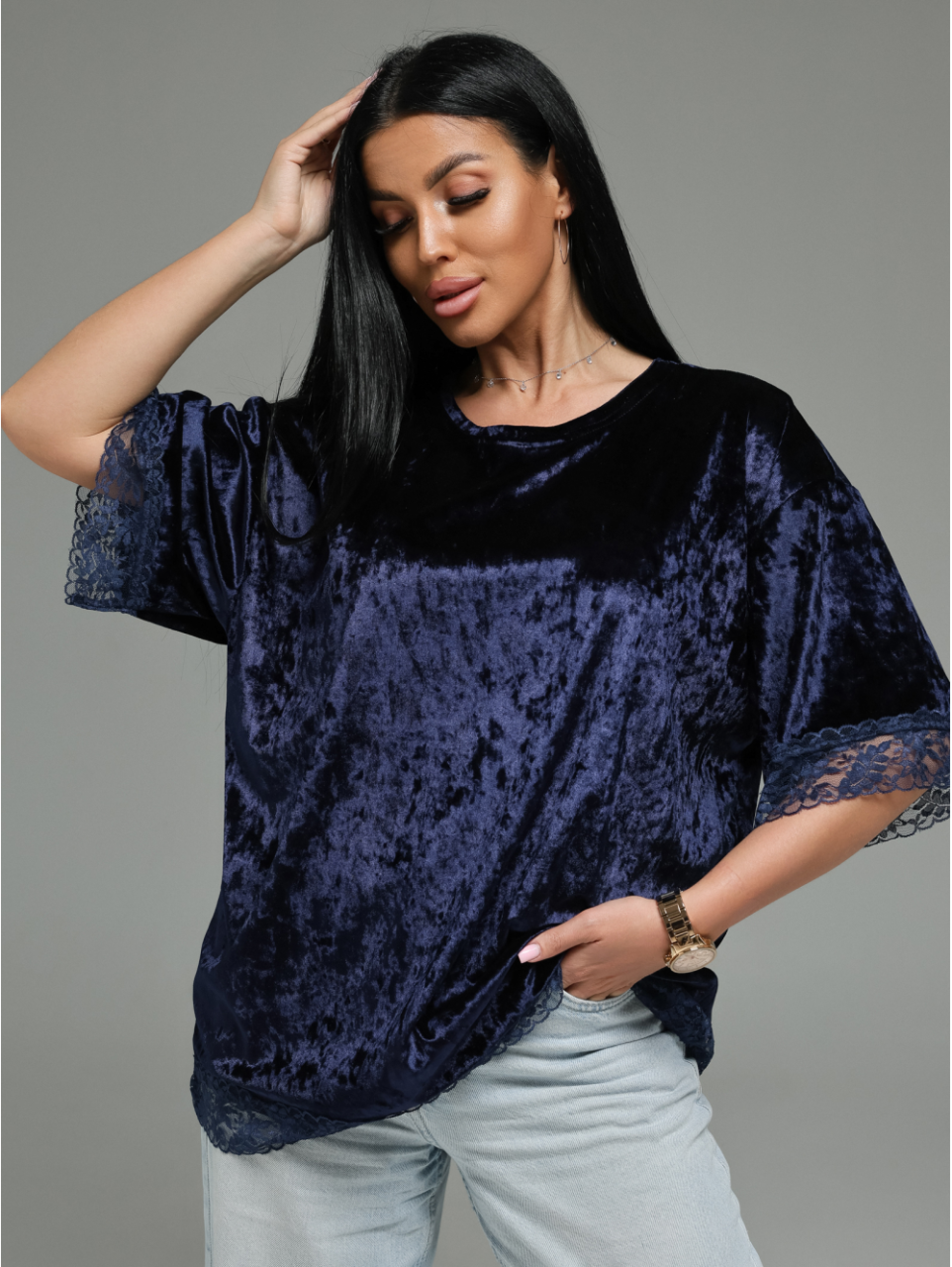 Сочетание роскошного бархата и нежного кружева — это смелый, но безупречно элегантный дуэт.Футболка подойдёт для создания как повседневных образов (с джинсами, брюками карго), так и для вечерних выходов (с юбкой, кожаными брюками).Оверсайз-крой дарит свободу, а кружево добавляет шарма.