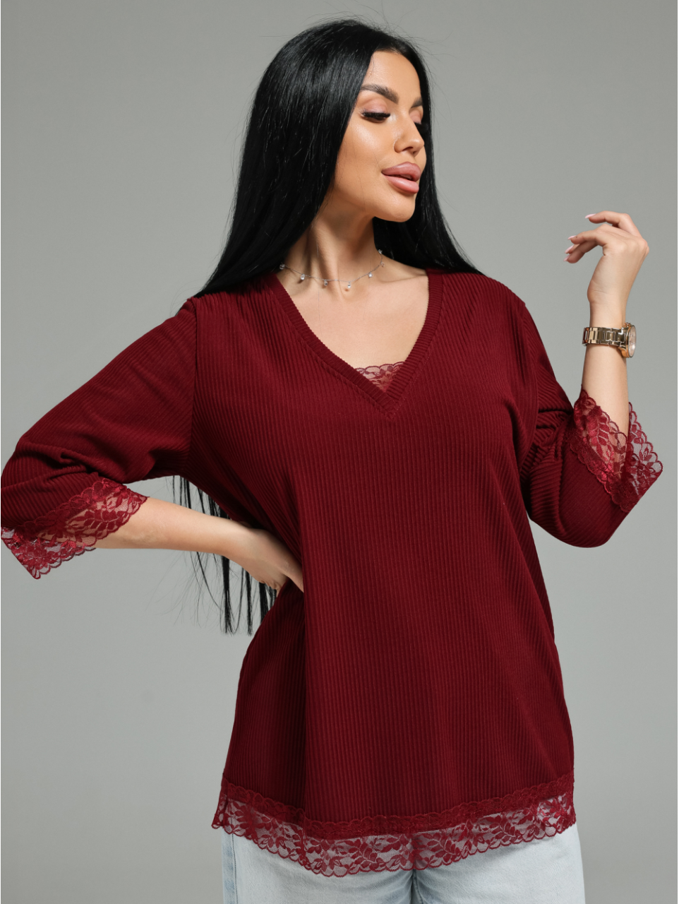 Женская футболка из кашемира «лапша» с кружевной отделкой.Силуэт: Прямой, свободный, не сковывающий движений и подходящий для разных типов фигур.Горловина:V-образный вырез — элегантный, визуально вытягивающий шею и добавляющий образу женственности.Материал:Кашемир «лапша». Это элитный трикотаж с объёмной фактурой в виде рельефных «макаронных» петелек.Ткань невероятно мягкая, лёгкая. Она выглядит дорого и статусно, а на теле создаёт ощущение нежной, бережной заботы.Кашемир «лапша» не теряет форму, устойчив к растяжению и сохраняет презентабельный вид долгое время.Отделка:Кружево — изящный контраст к лаконичному прямому крою.Деликатная кружевная вставка добавляет романтичности, делает модель особенной и превращает простую футболку в полноценную стильную вещь.Идеальный баланс между роскошью и повседневностью. Эта футболка подойдёт как для создания элегантного образа в паре с брюками или юбкой, так и для расслабленного аутфита с джинсами. Кружево и кашемир — это сочетание, которое говорит о вашем безупречном вкусе.
