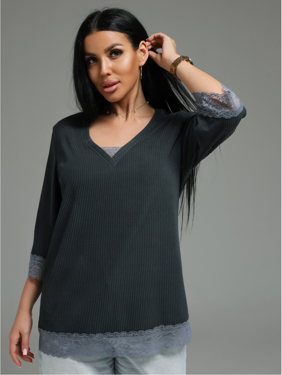 Женская футболка из кашемира «лапша» с кружевной отделкой.Силуэт: Прямой, свободный, не сковывающий движений и подходящий для разных типов фигур.Горловина:V-образный вырез — элегантный, визуально вытягивающий шею и добавляющий образу женственности.Материал:Кашемир «лапша». Это элитный трикотаж с объёмной фактурой в виде рельефных «макаронных» петелек.Ткань невероятно мягкая, лёгкая. Она выглядит дорого и статусно, а на теле создаёт ощущение нежной, бережной заботы.Кашемир «лапша» не теряет форму, устойчив к растяжению и сохраняет презентабельный вид долгое время.Отделка:Кружево — изящный контраст к лаконичному прямому крою.Деликатная кружевная вставка добавляет романтичности, делает модель особенной и превращает простую футболку в полноценную стильную вещь.Идеальный баланс между роскошью и повседневностью. Эта футболка подойдёт как для создания элегантного образа в паре с брюками или юбкой, так и для расслабленного аутфита с джинсами. Кружево и кашемир — это сочетание, которое говорит о вашем безупречном вкусе.