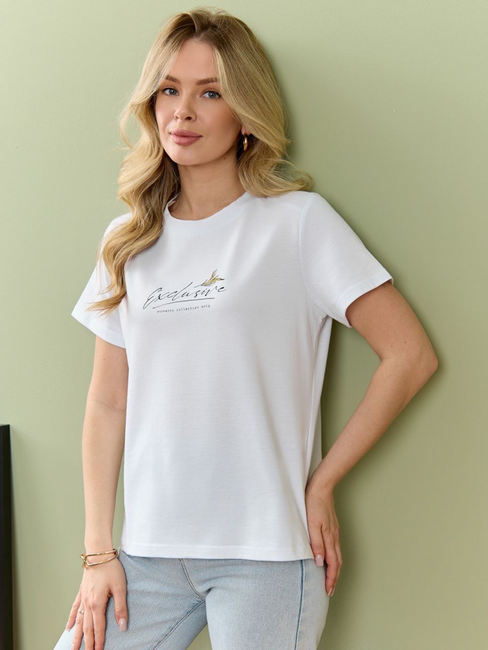 Футболка женская из гладкокрашеного полотна «кулирка», классического покроя, с короткими втачными рукавами, горловиной овальной формы, принтом на полочке, выполненным в технике «шелкографии». Плечевые швы изделия переходят на деталь