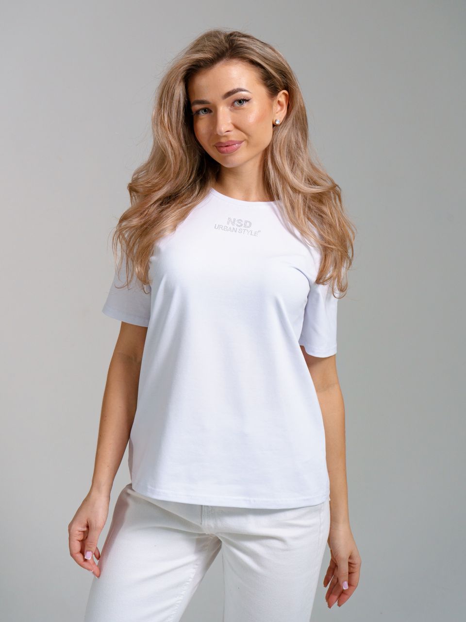 Футболка однотонная, с надписью из страз, создаст стильный и уверенный образ.