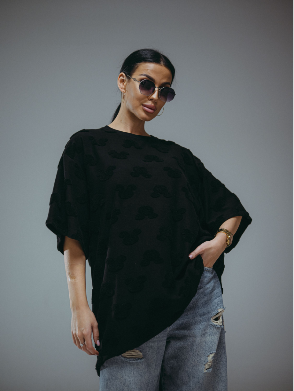 Женская футболка из махры жаккард «Ирбис [черный микки]» арт 85876