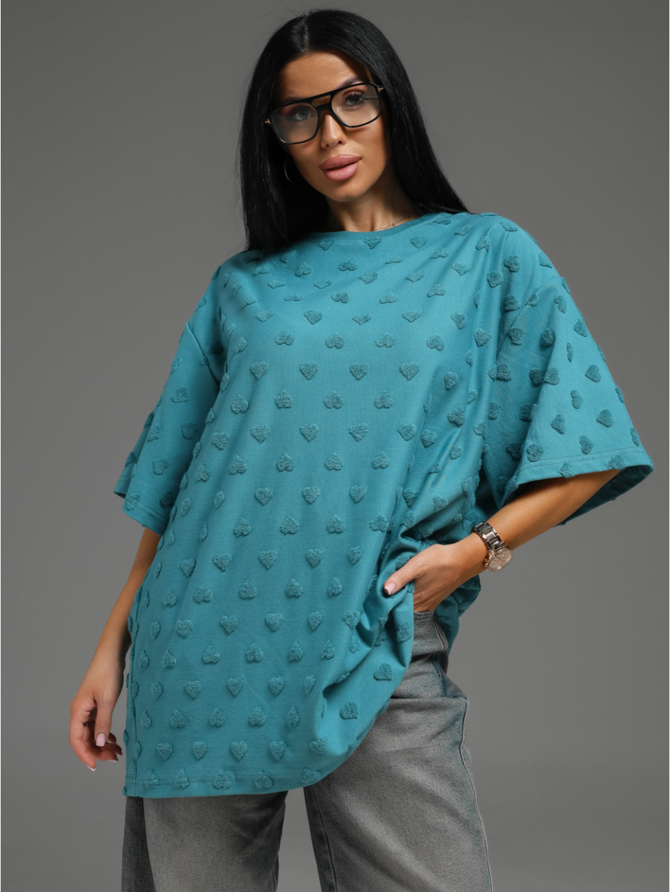 Женская футболка из махры жаккард «Ирбис [сердца петроль]» арт 83623