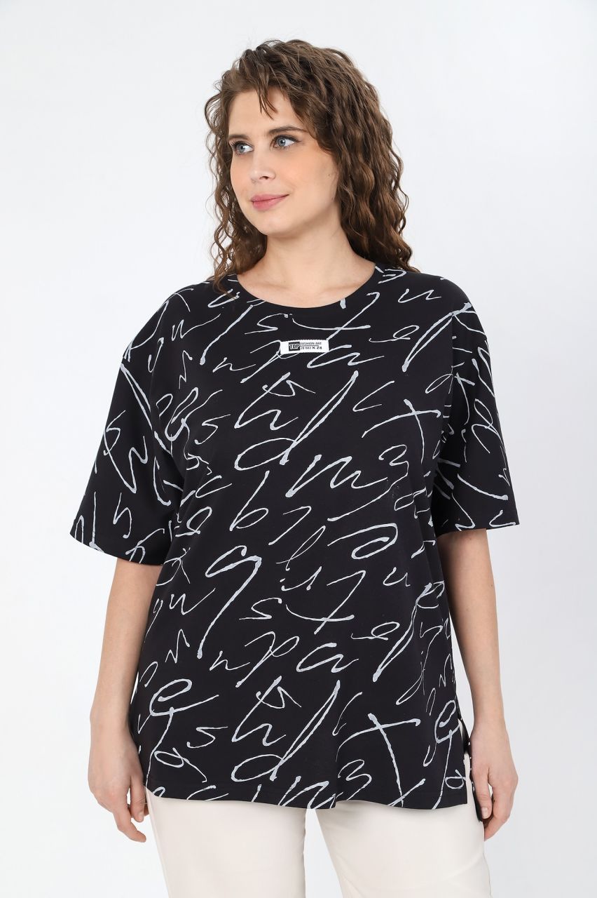Футболка женская из трикотажного полотна «кулирка» с набивным рисунком, свободного покроя, со спущенным плечом и втачными рукавами длиной до локтя, горловиной овальной формы, обработанной втачной планкой, по центру полочки настрочен декоративный элемент, в нижней части боковых швов – разрезы.