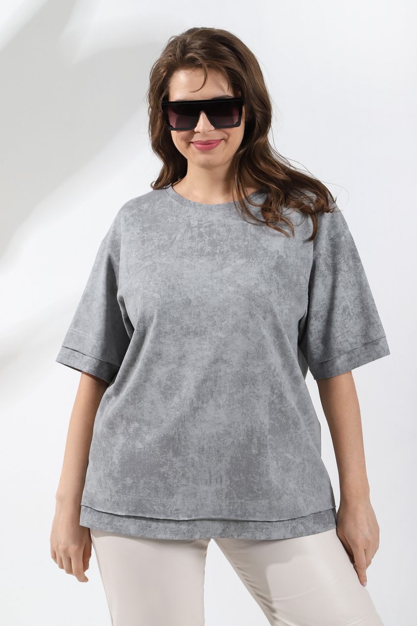 Футболка из гладкокрашеного трикотажного полотна «кулирка» с эффектом «варенки», свободного покроя, горловиной овальной формы, обработанной притачной планкой. Низ рукавов и изделия состоит из двух частей, одна из которых с необработанным краем, другая с подгибкой и соединенных между собой накладным швом.