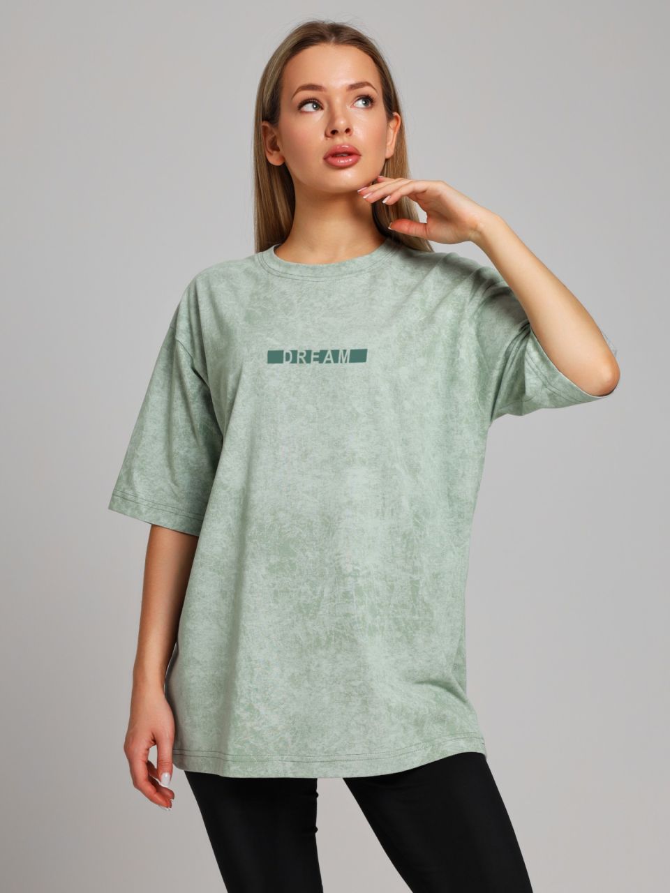 Футболка женская из трикотажного полотна "кулирка-варенка", с удлиненными плечевыми швами, втачными короткими рукавами, горловиной овальной формы, обработанной втачной планкой, и принтом на детали переда, выполненным в технике шелкографии. По горловине изделия настрочена отделочная строчка.