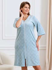Халат женский из гладкокрашеного полотна «велюр» с рисунком, выполненным тиснением на термопрессе. Изделие прямого силуэта, с втачными рукавами длиной ¾, горловиной овальной формы, карманами в боковых швах и центральной бортовой застежкой на тесьму «молния».