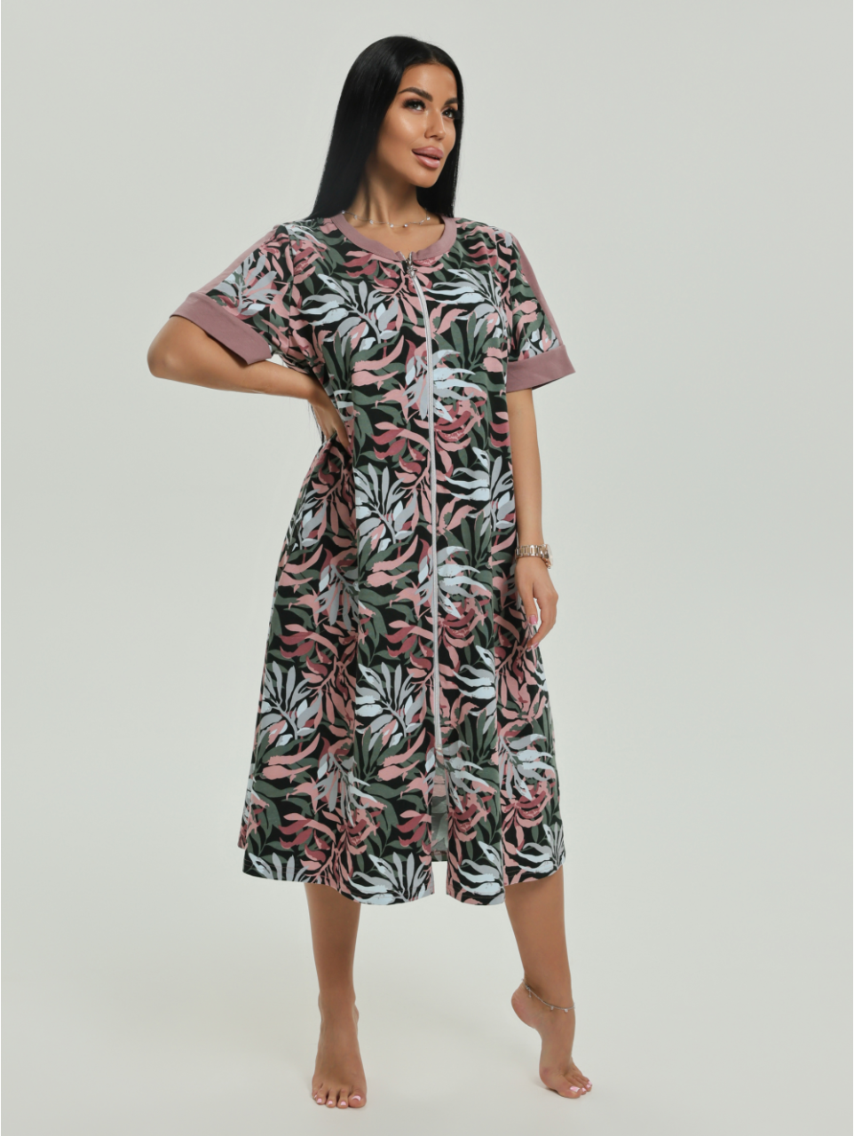 Халат женский с центральной застежкой-молнией, с коротким втачным рукавом.