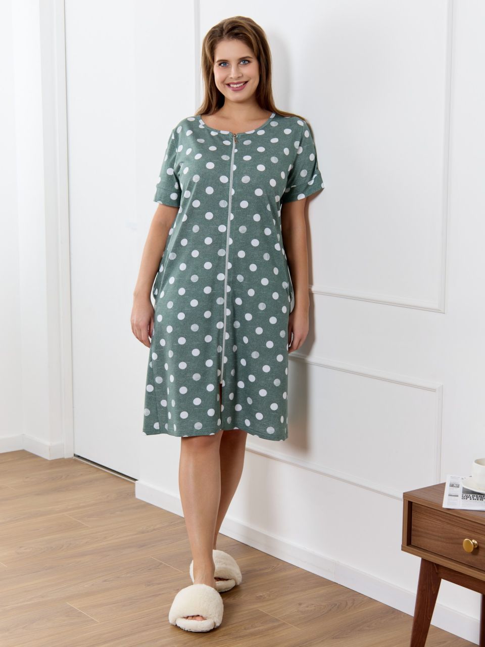 Халат женский из трикотажного полотна кулирка с набивным рисунком, прямого силуэта, с короткими втачными рукавами, обработанными манжетами, бортовой застежкой на тесьму «молния» и карманами в боковых швах. Горловина овальной формы окантована основным материалом.