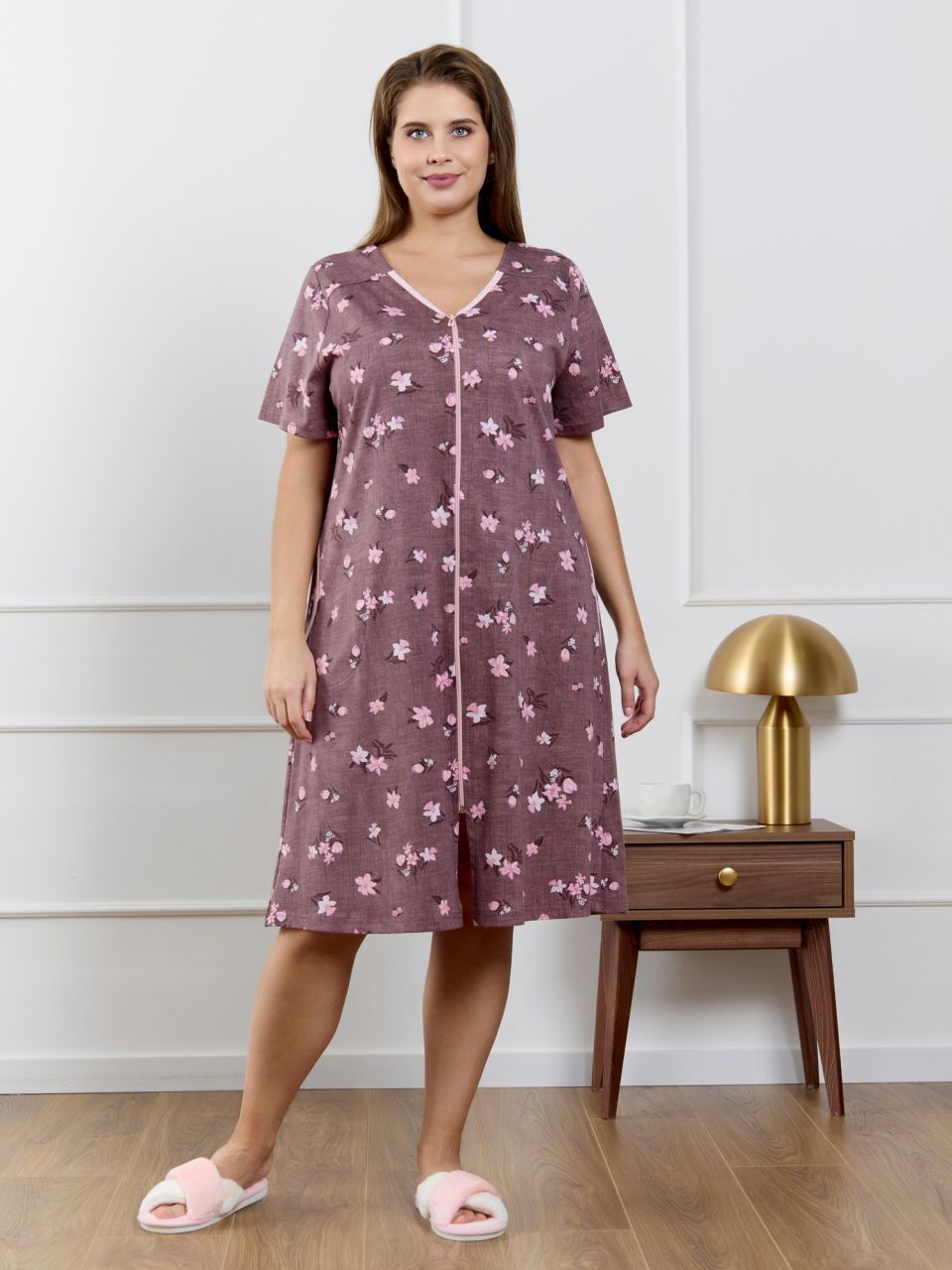 Халат женский из трикотажного полотна «кулирка» с набивным рисунком, прямого силуэта, с короткими втачными рукавами, горловиной V- образной формы, карманами в боковых швах и центральной бортовой застежкой на тесьму «молния». Полочка – с двумя небольшими двойными кокетками, выполненными по косой линии. Горловина переда, входы в карманы окантованы контрастным материалом.