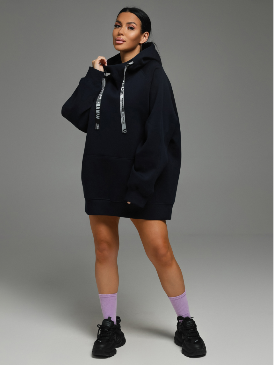 Худи – oversize кроя с капюшоном, с притачным поясом по низу, с длинным рукавом реглан на манжете.