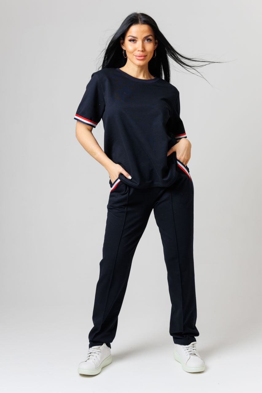 Женский костюм с брюками выполнен из трикотажного полотна. Костюм состоит футболки и брюк. Умерено свободная футболка имеет округлый вырез, короткие втачные рукава декорированные трикотажной вязаной тесьмой. Брюки прямые с фиксированными стрелками и боковыми карманами. Карманы на брюках отделаны трикотажной вязаной тесьмой. Стильный легкий модный костюм с брюками идеально походит для тренировок, дома, офиса, прогулок и путешествий. Он сшит по универсальным лекалам, которые позволяют скрывать все недостатки фигуры и выгодно подчеркнуть ее достоинства.