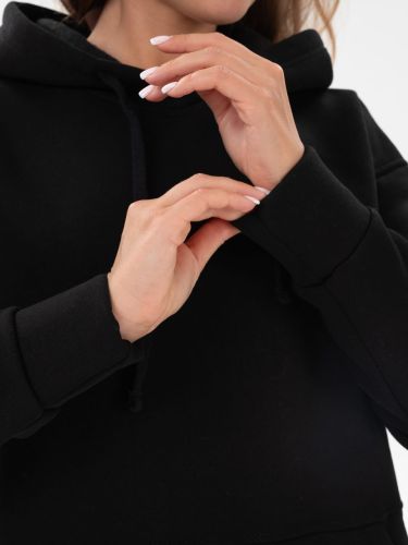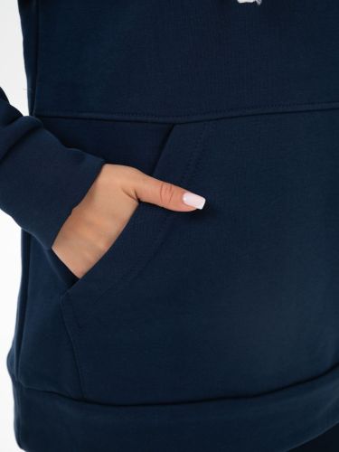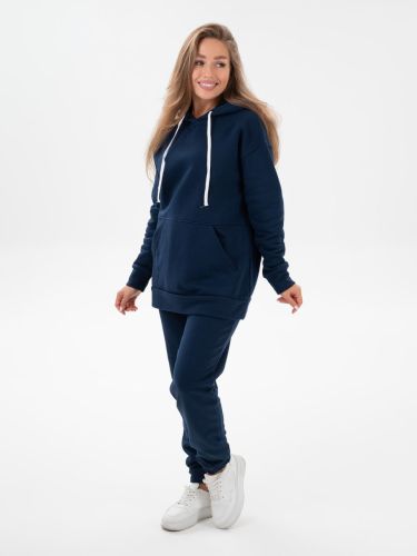 Костюм состоит из брюк и толстовки, выполнен из мягкого теплого футера с начесом. Брюки на манжете, с карманами, пояс выполнен на поясной машине. Толстовка с капюшоном, карман кенгуру, на манжете.