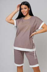 Костюм женский с бермудами идеальное решение для летнего гардероба. Костюм сшит из трикотажного полотна кулирки с лайкрой, которая придает ему дополнительную мягкость и удобство в носке. Комплект подходит как для повседневной носки, так и для отдыха на даче. Футболка имеет округлый вырез, короткие цельнокроеные рукава, на груди футболки принт в виде мерцающих страз. Бриджи выполнены из ткани компаньона, по линии талии мягкая эластичная резинка.