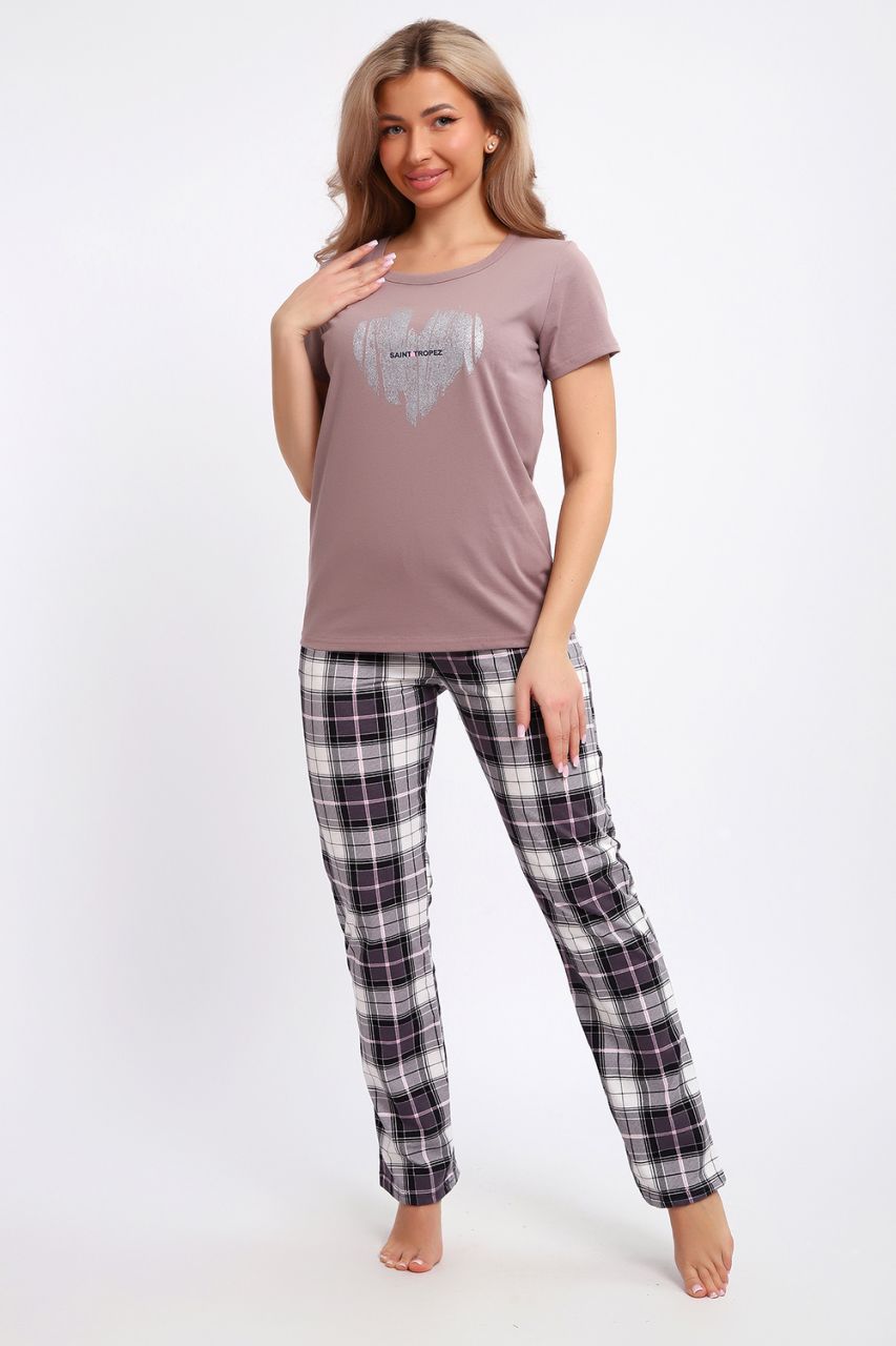 Комплект футболка + брюки из хлопкового полотна кулирка. Футболка цвета кофе с молоком, на полочке серебристый принт в виде стилизованного сердечка, брюки в клетку, с карманами, пояс на резинке.