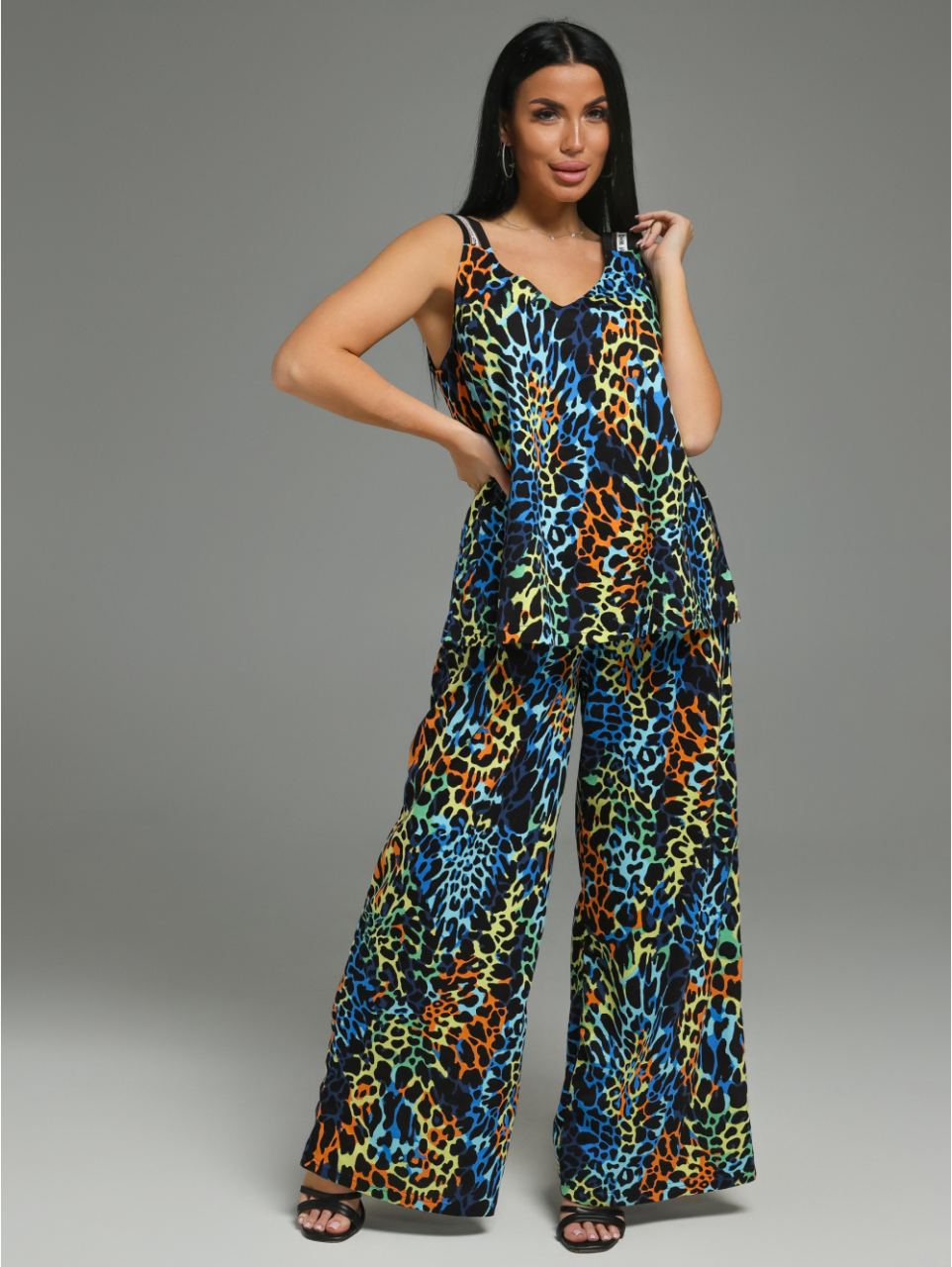 Костюм состоит из топа и брюк. Вырез горловины топа на полочке и спинке V- образный. Лямки топа выполнены из декоративной резинки. Брюки прямые от бедра с отрезным поясом.