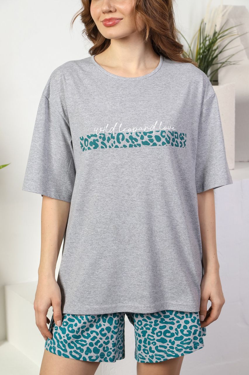Костюм женский из трикотажного полотна «кулирка» в комбинации двух видов: с набивным рисунком и гладкокрашеного в единой цветовой гамме, состоящий из футболки и шорт. Футболка - из гладкокрашеного полотна, классического покроя, с короткими втачными рукавами, горловиной овальной формы, обработанной окантовкой из основного материала и принтом на полочке, выполненным в технике «шелкографии». Шорты – из полотна с набивным рисунком, свободные, с карманами в боковых швах, на притачном поясе с эластичной тесьмой внутри.