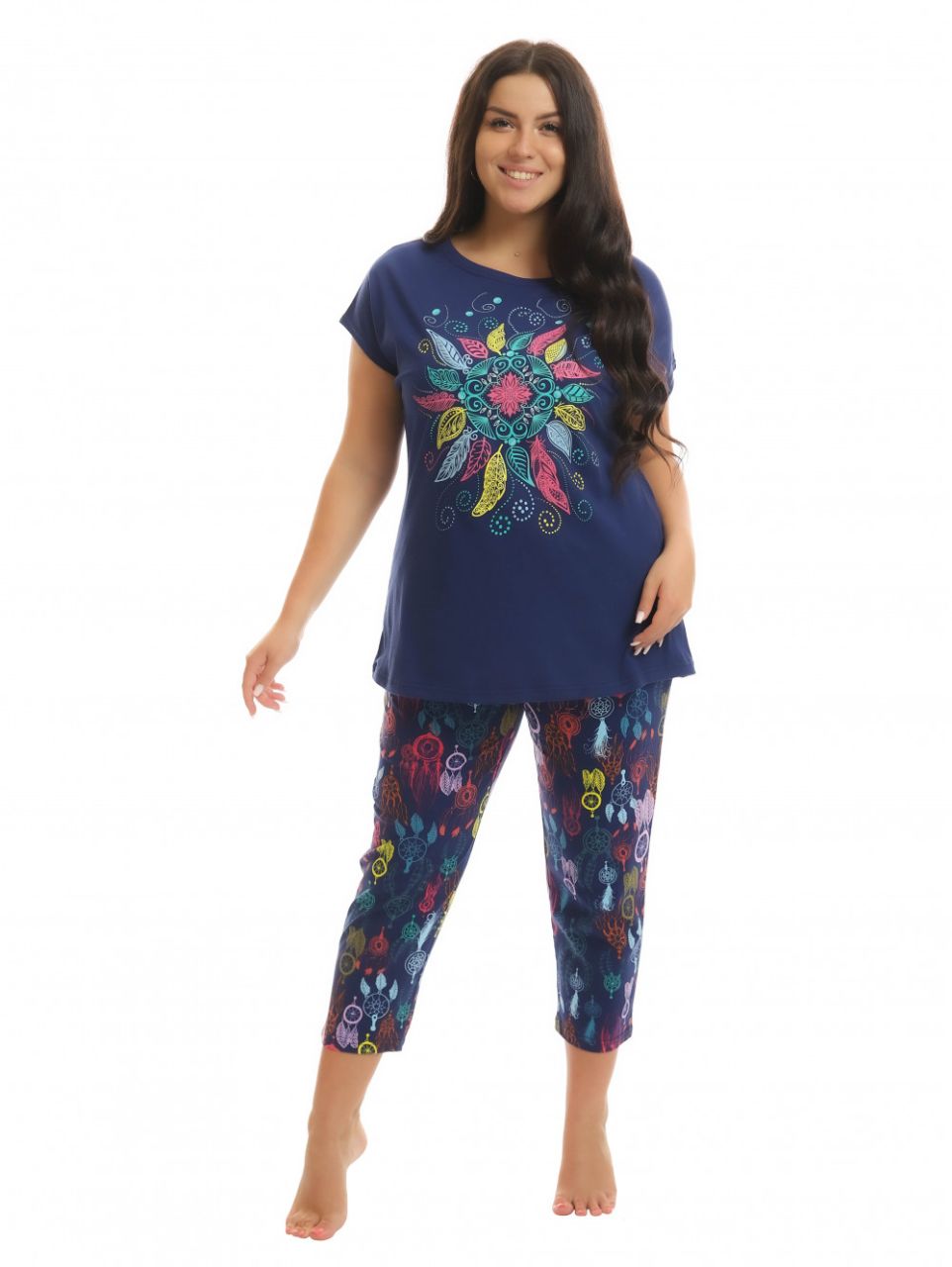 Всё девушки хотят выглядеть красивыми не только на улице, но и дома, когда приходится заниматься бытовыми хлопотами. Мы рекомендуем Вам домашний костюм из хлопка футболка+бриджи. Футболка с коротким рукавом и оригинальным принтом. Бриджи чуть ниже колена с карманами. В этом костюме Вы будете чувствовать себя уютно и комфортно.