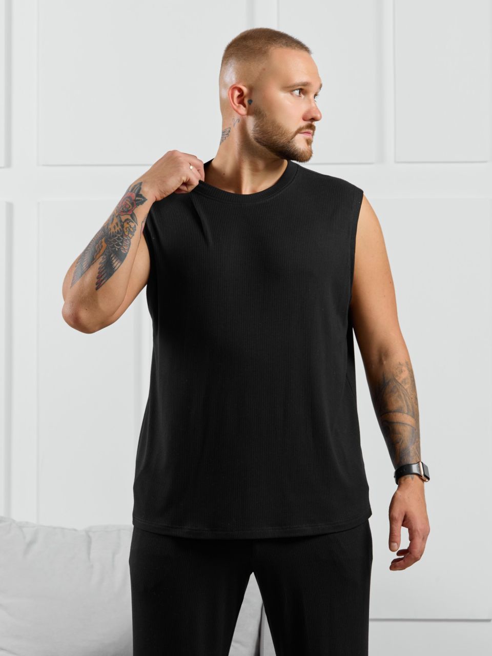 Майка мужская из пластичного однотонного трикотажного полотна в рубчик, приятного к телу. Модель свободная, с широкой спущенной линией плеч, глубокой проймой. Может подойти для отдыха, прогулок и занятий в спортзале.