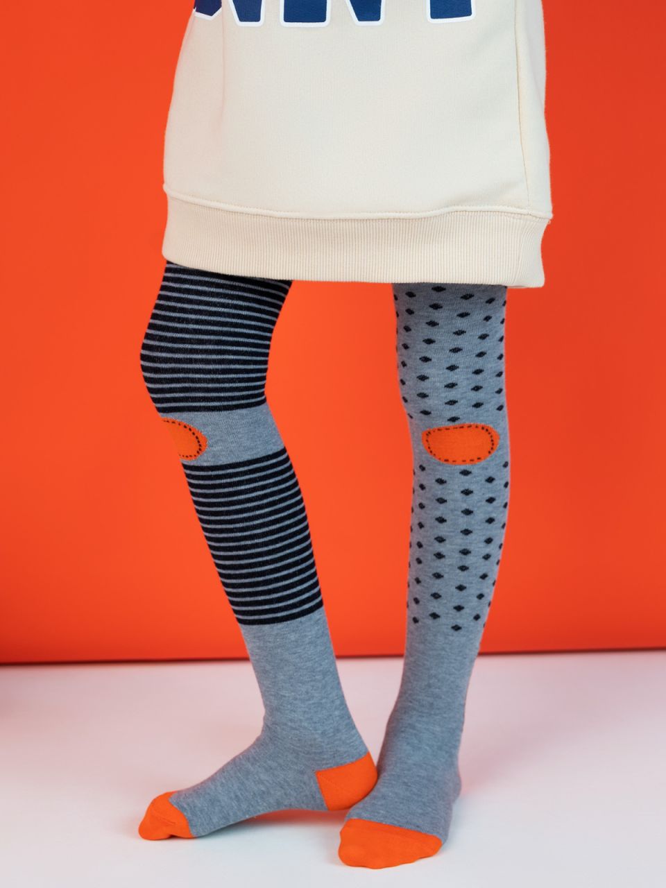 Демисезонные детские колготки из хлопка с компьютерным рисунком «Жирафы» и необычным распределением разного рисунка (полоски, ромбики) по всей длине ножки. Креативность изделия подчеркивается дублированием рисунка на ластовице.