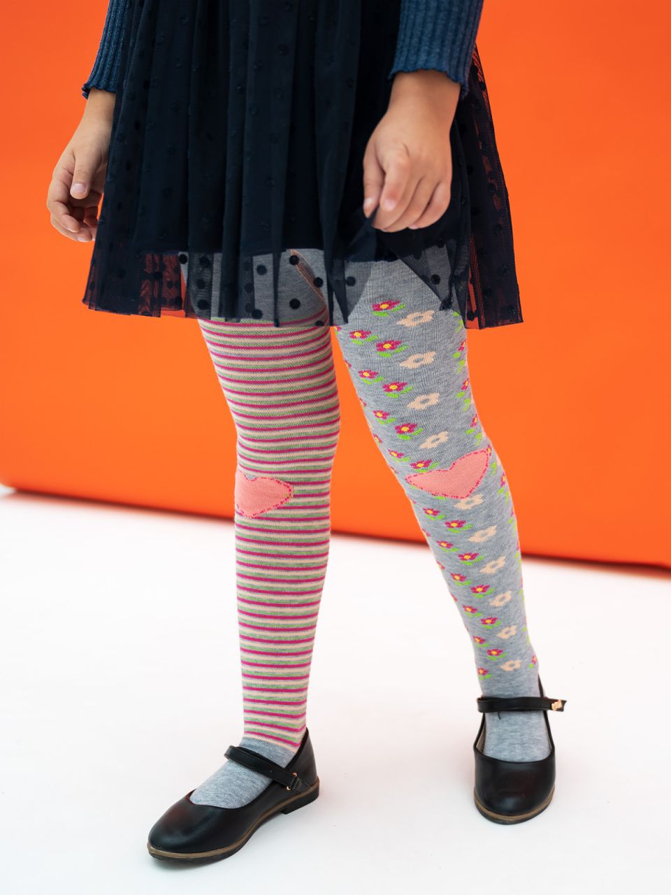 Демисезонные детские колготки из хлопка для девочек с надписью « Girl» на ластовице и необычным распределением рисунка (полоски, цветочки) по всей длине ножки, имитация заплаток в виде сердечка добавит фантазийности и креатива данной модели.