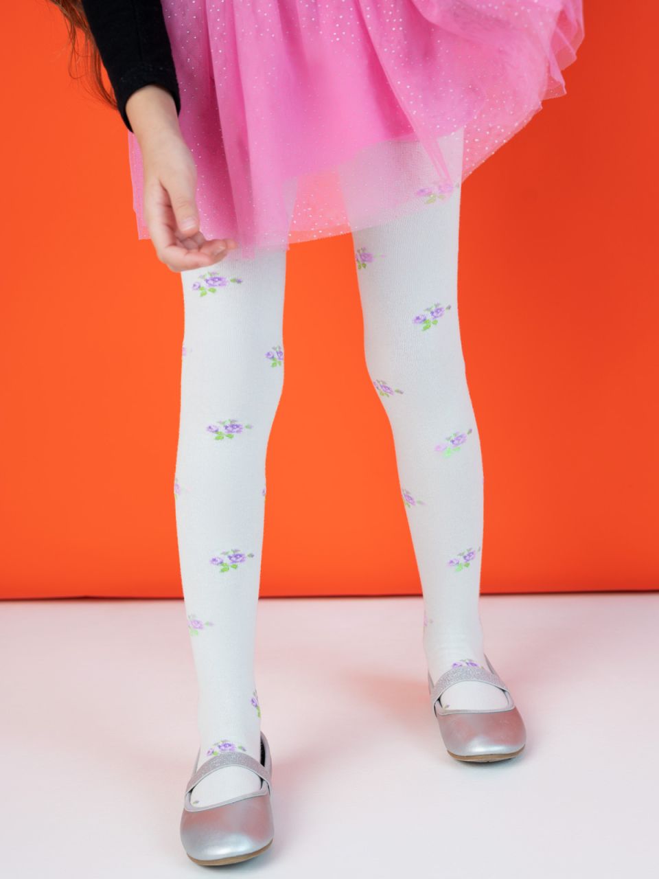 Детские демисезонные колготки для девочки. Комфортная модель, связанная из натурального гребенного хлопка, подходящая для повседневной носки. Колготки приятной расцветк в сочетании с маленькими рисунками цветочков точно оценят маленькие модницы.