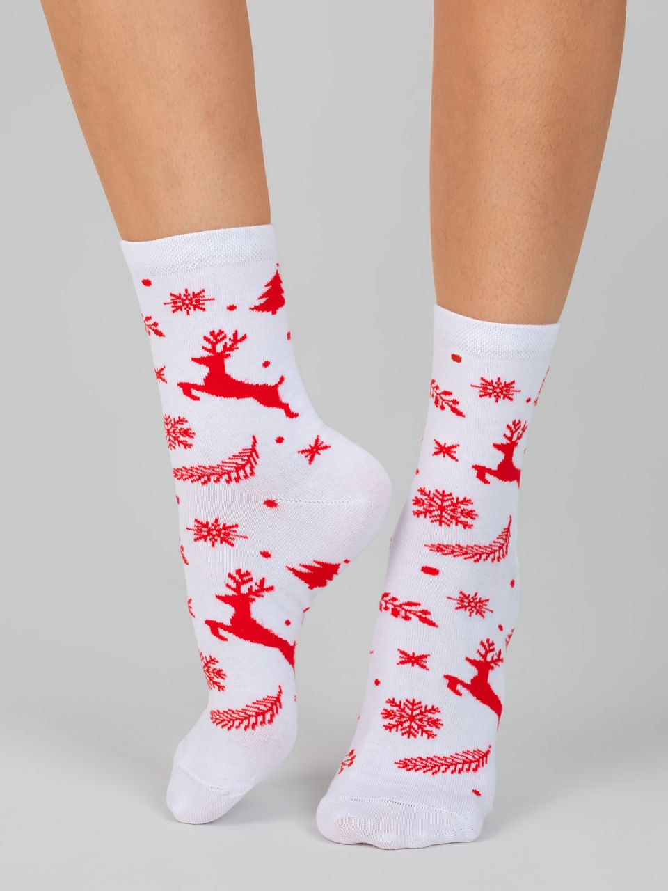 Новогодние женские носки. Мягкая основа – натуральный гребенной хлопок, который обеспечит максимальный комфорт и уют на протяжении дня. Эластичная резинка надёжно фиксирует изделие, не сдавливая при этом ногу. Яркие носки с рисунком оленей сделают ваше настроение особенно праздничным и станут отличным подарком для близких, который подчеркнет вашу заботу и любовь.
