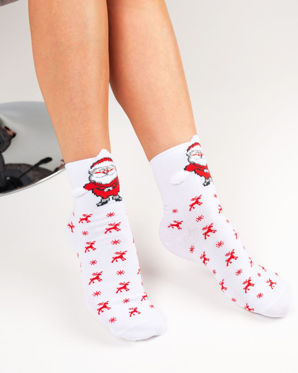 Женские носочки с новогодним рисунком. Мягкая основа из натурального гребенного хлопка подарит комфорт женским ножкам на протяжении всего дня. Добавление синтетических нитей обеспечит эластичность и долговечность изделия. Оригинальность модели подчёркивается за счёт использования фантазийной пряжи, которая создаёт эффект естественной бороды и натуральной опушки шапки и шубки Санта – Клауса. Носки с очаровательным рисунком – отличный подарок к Новому году для ваших близких.