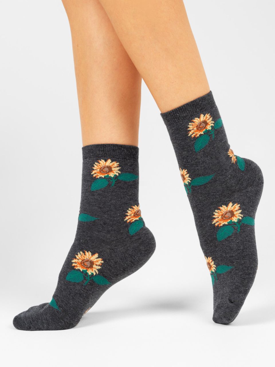Классическая модель с рисунком цветов подсолнуха. В составе изделия натуральный гребенной хлопок – носки комфортные и тактильно приятные. Модель прекрасно подходит для повседневной носки.