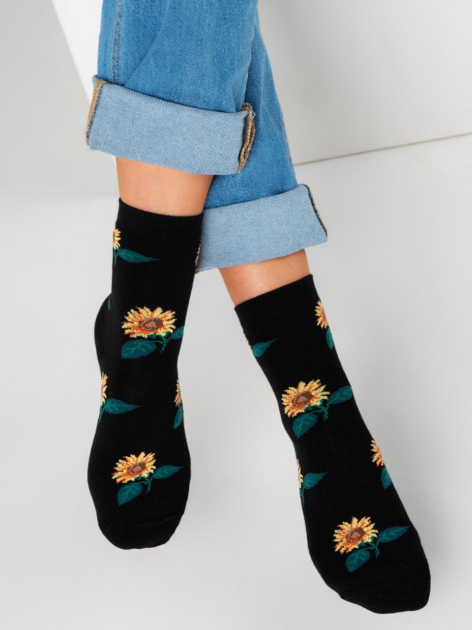 Классическая модель с рисунком цветов подсолнуха. В составе изделия натуральный гребенной хлопок – носки комфортные и тактильно приятные. Модель прекрасно подходит для повседневной носки.