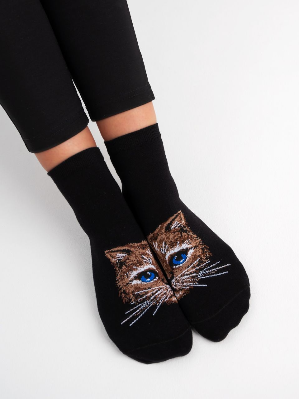 Женские носки с парным рисунком кошачьей мордочки. Мягкая основа из натурального хлопка обеспечивает повышенный комфорт, а синтетические нити в составе отвечают за эластичность и устойчивость к истиранию. Обворожительный рисунок никого не оставит равнодушным. Носки дополнят образ и добавят яркие акценты в ваш гардероб.